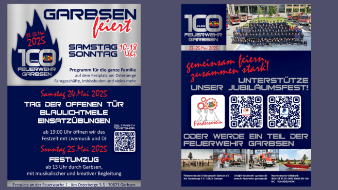 Ein ganz besonderes Jubiläum steht bevor: Die Ortsfeuerwehr Garbsen feiert vom 23. bis 25. Mai 2025 ihr 100-jähriges Bestehen. Auf dem Festplatz gegenüber dem Feuerwehrhaus in Altgarbsen (Am Osterberge) erwartet Besucherinnen und Besucher ein abwechslungsreiches Programm für die ganze Familie.