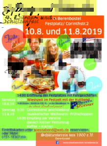 Um 14:00 Uhr werden befreundete Vereine im Zelt begrüßt, anschließend findet ein kleiner Festumzug durch Berenbostel statt. Das Fest wird an beiden Tagen mit kulinarischen Leckereien vom „Party Service und Wildspezialitäten Frank Kruse“ aus Schneeren bereichert.