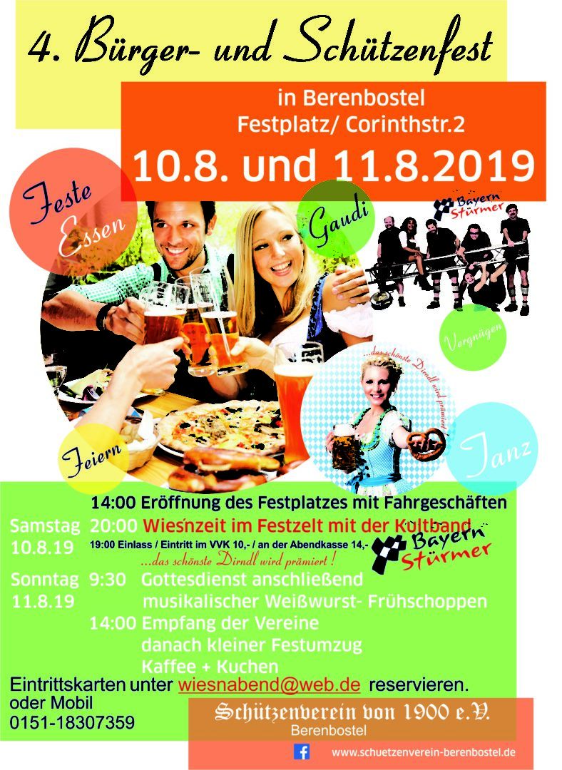 Garbsen – Der Schützenverein von 1900 e.V. Berenbostel veranstaltet am zweiten Wochenende im August 2019 sein 4. Bürger- und Schützenfest auf dem Festplatz/ Corinthstr. 2 in Berenbostel. Dazu sind alle Bürgerinnen und Bürger natürlich eingeladen.
