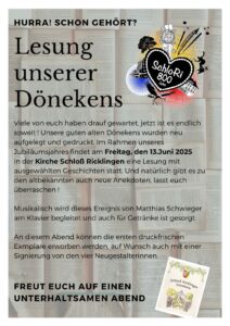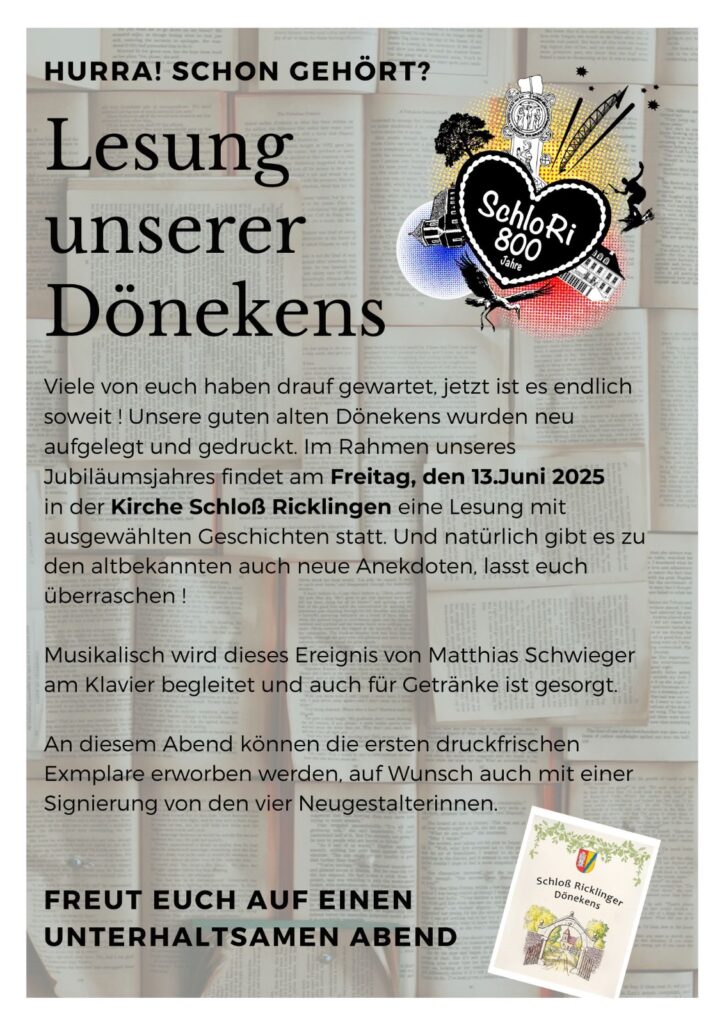 Ein besonderer Abend voller Charme, Geschichte und Schmunzeln erwartet die Besucher am Freitag, den 13. Juni um 20 Uhr in der stimmungsvollen Kirche von Schloss Ricklingen. Im Rahmen des 800-jährigen Jubiläums des Stadtteils wird eine Lesung der neu aufgelegten „Dönekens“ veranstaltet – heitere, kuriose und erinnerungswürdige Anekdoten aus dem Dorfleben vergangener Zeiten.