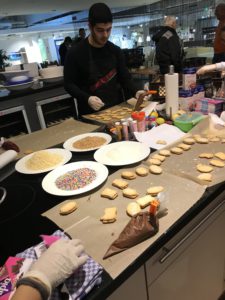 Janet Nesmedin hatte dafür das nötige Material zum Füllen und Verzieren liebevoll vorbereitet, damit alle Helfer den größtmöglichen Spaß haben. Während eine Gruppe der fleißigen Hände mit dem Ausrollen des Teigs sowie dem Formen und Backen betraut war, kümmerten sich die anderen Beteiligten ums Dekorieren und Verpacken. Janet behielt jederzeit die Übersicht und führte das große Schülerteam in einem anstrengenden aber freudigen Arbeitstag von etwa 6 Arbeitsstunden zum gemeinsamen Erfolg.