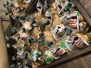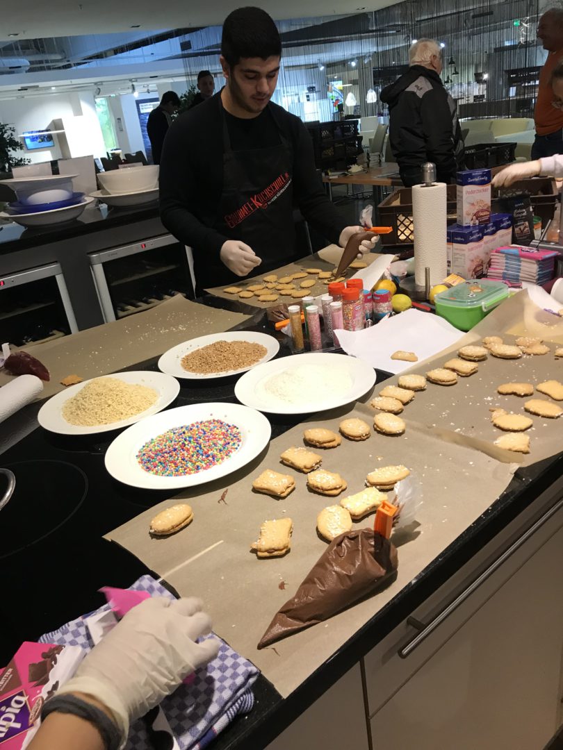 Möbel Hesse stellte für diesen arbeitsaufwendigen Backtag im Küchenstudio die notwendige Technik zur Verfügung. Bäckerei Hanisch rührte den Keksteig an und backte einen Teil der insgesamt 75 Kg schon einmal vor. Sonst wäre diese Menge für die 555 Plätzchen-Tüten gar nicht an einem Tag zu bewältigen gewesen.