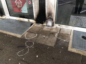 Zwei Zeugen hatten gegen 02:40 Uhr die Rettungskräfte verständigt. Beide waren gemeinsam auf dem Nachhauseweg gewesen und hatten die Sandstraße in Richtung Planetenring befahren, als sie auf Flammen an den Schaufenstern bzw. der Außenfassade und dem Vordach der beiden Geschäfte – einem Handyladen und einem Kiosk – aufmerksam wurden. Darüber hinaus bemerkten sie zeitgleich vier dunkel gekleidete Personen, die in den Spannweg wegliefen. Die Zeugen verfolgten die Flüchtenden noch ein Stück mit dem Auto, verloren sie dann aber aus den Augen. Anschließend kehrten die beiden zu der Ladenzeile zurück und traten zwei kleinere Brände nahe der Außenfassade aus, ehe die Feuerwehr eintraf und die qualmende Dachpappe des Vordachs ablöschte. Eine sofort eingeleitete Fahndung, bei der auch ein Hubschrauber eingesetzt war, verlief ohne Erfolg. Im Rahmen der sich anschließenden Untersuchungen und Überprüfungen stellten Polizeibeamte fest, dass die Täter offensichtlich versucht hatten, mit Steinen die Scheiben einzuwerfen und letztlich an der mit Sicherheitsglas ausgestatteten Scheibenfront, die lediglich splitterte, gescheitert waren. Darüber hinaus stellten sie durch Brandsätze verursachte Beschädigungen an der Außenfassade sowie des Vordachs der Geschäfte fest. Des Weiteren entdeckten die Beamten in der Nähe, auf dem Gehweg, Zettel mit dem handschriftlichen Text „G.L. Afrin“.