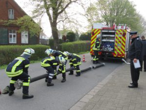 Bei angenehmen Temperarturen und Sonnenschein wurden die praktischen Prüfungsteile rund um das Feuerwehrhaus in Stelingen in zwei Gruppen absolviert.