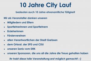 Alle Garbsenerinnen und Garbsener sind herzlich eingeladen dem runden Geburtstag einen entsprechenden Rahmen zu geben und die Läufer kräftig anzufeuern. Für Essen und Trinken sorgt auch dieses Jahr wieder das Team der Rathaus-Terrasse. Gleichzeitig feiert der „Laufpass der Region“ seinen 15jährigen Geburtstag und wird auch auf dem Rathausplatz dabei sein. Beim Garbsener City Lauf zählt der Real-Lauf zum HAZ-Ranking. Weitere Infos unter http://laufblog.haz.de/