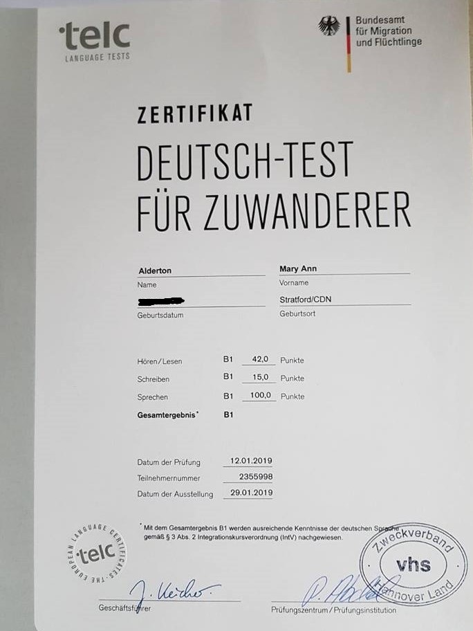 In diesem Jahr hat Mary-Ann nun die Möglichkeit Ihre Einbürgerung gezielt vorzubereiten und zu beantragen. Einen Meilenstein hat sie schon genommen, der 1. Sprachkurs ist erfolgreich abgeschlossen. Mary-Ann war eine aufmerksame und zuverlässige Schülerin, hat nie gefehlt und das sieht man auch am Ergebnis.