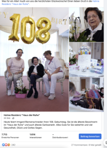 Als GCN den Beitrag der Seniorenresidenz in den sozialen Netzwerken wie Facebook und Instagram geteilt hat, gesellten sich noch Hunderte Gratulanten dazu und wünschten Irmgard weiterhin viel Gesundheit und alles Gute. Das Haus der Ruhe schreibt auf Facebook: „Es ist wirklich beeindruckend, wenn man bedenkt: Frau Riemenschneider ist vor dem 1. Weltkrieg geboren, als Deutschland noch einen Kaiser hatte!“