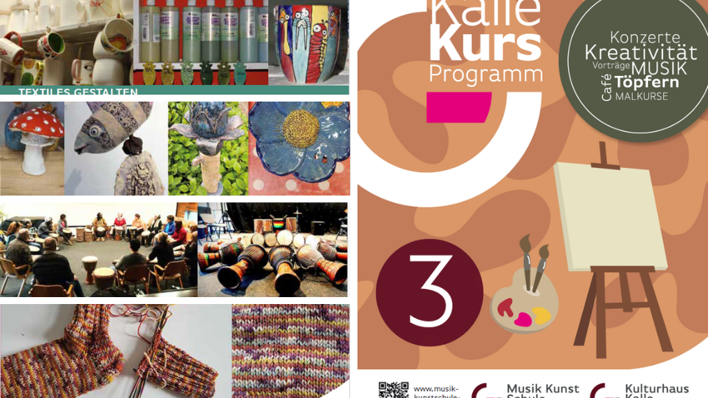 Das Kalle-Programm bietet außerdem zahlreiche Kurse für Kinder, Jugendliche und Erwachsene. Von Töpfern, Nähen und Porzellanmalen über Aquarell- und Acrylmalerei bis hin zu Trommelworkshops – für jeden ist etwas dabei. Neu im Programm sind unter anderem ein Kunstkurs für Minis ab einem Jahr, Papierschöpfen für alle Altersgruppensowie ein Porträt-Workshop für Anfänger.