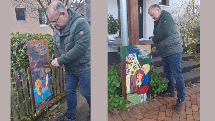 Jens Schmidt beim Anbringen der Märchenbilder./Fotos privat