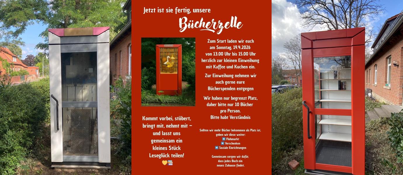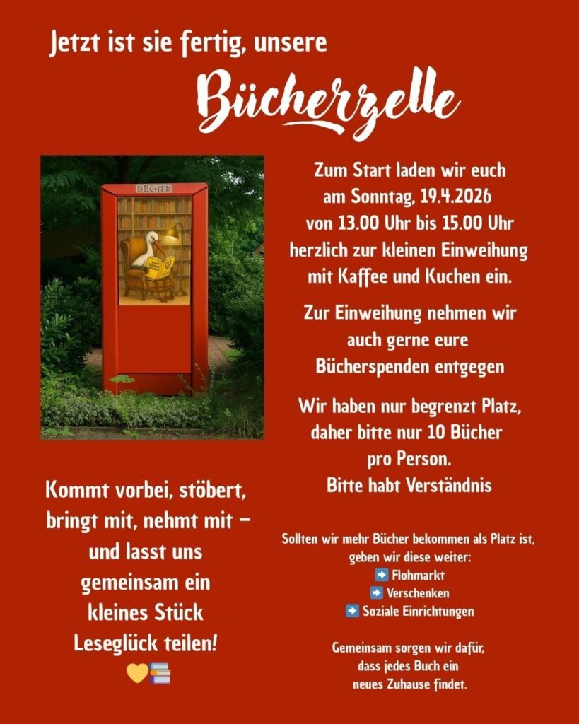 Am 19. April von 13 bis 15 Uhr sind alle Bürgerinnen und Bürger herzlich eingeladen, die neue Bücherzelle bei Kaffee und Kuchen kennenzulernen. Die Vorfreude im Ort ist groß – nicht zuletzt, weil viele Schloß Ricklingerinnen und Schloß Ricklinger das Projekt immer wieder nachgefragt haben.