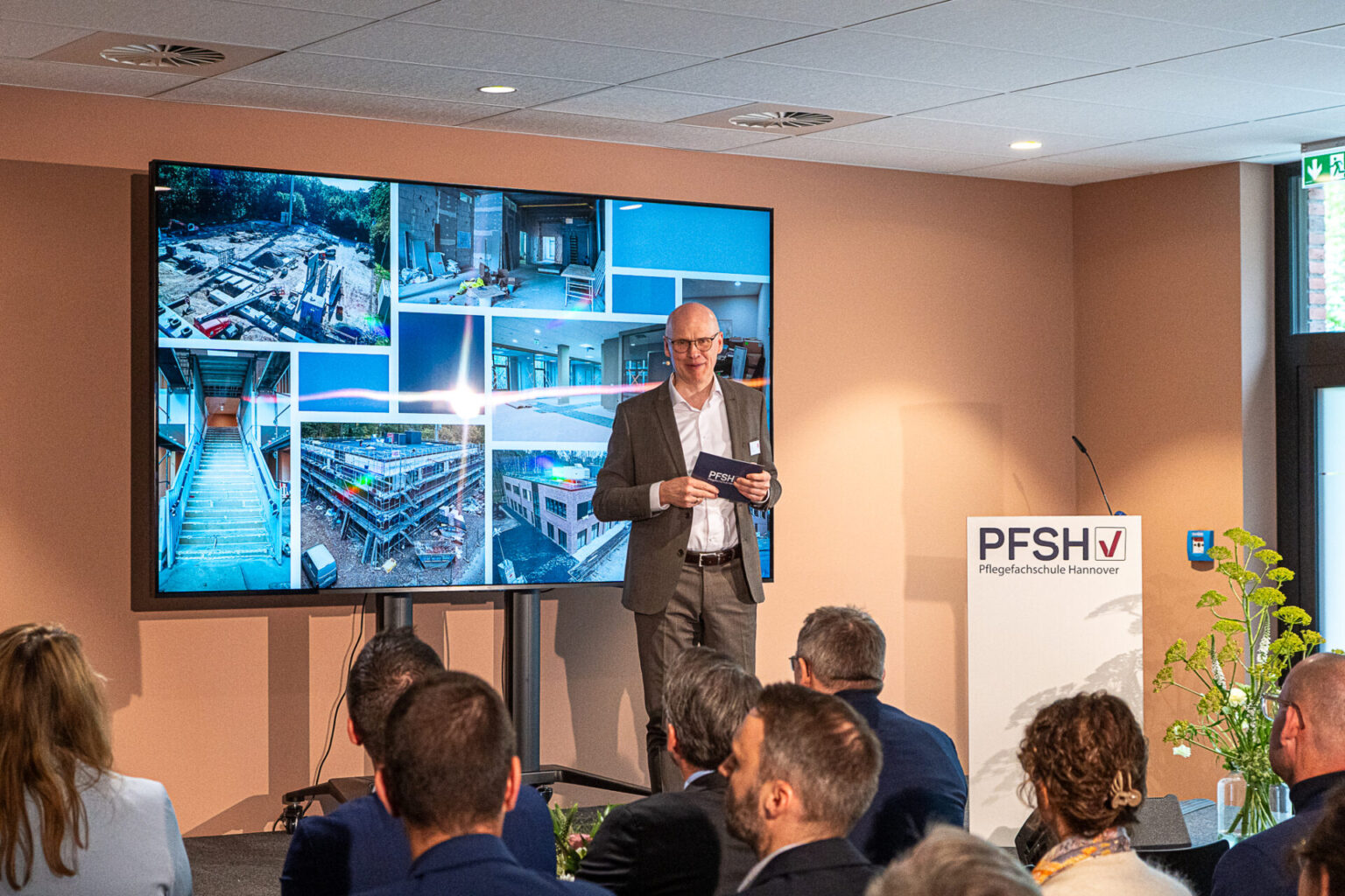 Carl Hahne, Leiter der Geschäftsführung bei Hahne Holding GmbH, begrüßte die sehr zahlreichen Gäste und präsentierte die Ideen, die hinter dem Konzept der neuen Pflegeschule stehen. Er freute sich, dass die Planung innerhalb von 22 Monaten fristgerecht und im Rahmen der Kostenplanung vollumfänglich gelungen ist.
