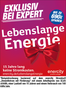 Energieeffiziente Geräte anschaffen und LebenslangeEnergie von enercity und expert geschenkt bekommen. Beim Kauf in einer der o.g. Filialen lassen Sie einfach beim Kauf das Formular von einem Mitarbeiter/in von expert ausfüllen und ergänzen Sie Ihre persönlichen Angaben – enercity erledigt den Rest. Bei dieser Aktion können alle teilnehmen, die schon Kunde bei enercity sind oder einen neuen Vertrag abschliessen. Weitere Infos erhalten Sie auch hier.