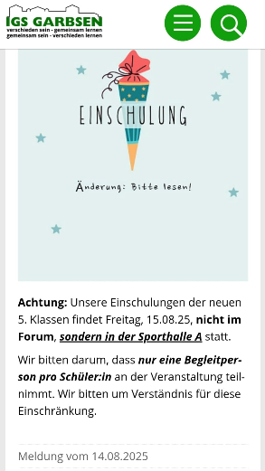 Viele Eltern hatten sich darauf gefreut, ihren Kindern bei der Einschulung heute am Freitag in die 5. Klasse an der IGS Garbsen beizuwohnen. Einen Tag vor der Feier – am Donnerstag – wurde ihnen jedoch über verschiedene Eltern-Gruppen oder über Social Media mitgeteilt, dass pro Kind nur eine Begleitperson zugelassen ist. Besonders hart trifft das Väter, die sich extra freigenommen hatten, um diesen wichtigen Moment gemeinsam mit ihrem Kind zu erleben. Deshalb haben viele Mütter allein an der Zeremonie teilgenommen.  Vor allem sind die Eltern verärgert, dass die Nachricht so spät kam.