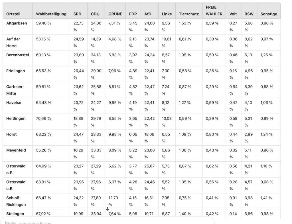 Die Wahlergebnisse unterscheiden sich je nach Stadtteil teils erheblich. Hier eine Übersicht der Stimmanteile (Zweitstimmen) in den wichtigsten Ortschaften: