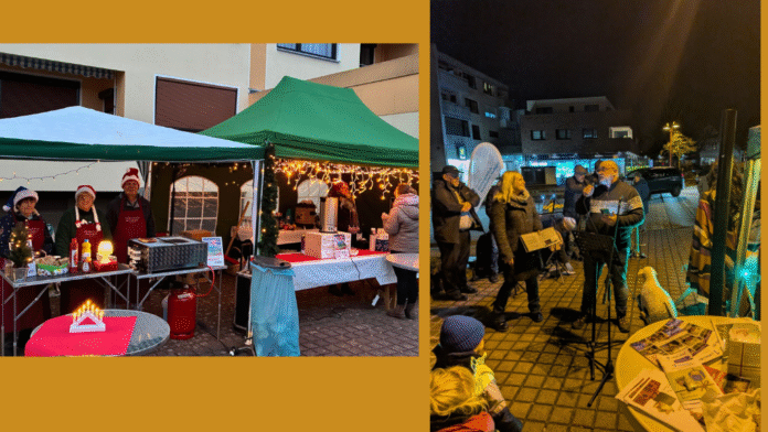 Im Anschluss folgte eine kurze Andacht der katholischen Maria-Regina-Kirche, begleitet von weihnachtlichen Klängen des Posaunenchors. Bei winterlicher Musik und warmen Getränken ließ die Besucherschaft den Abend anschließend gemütlich ausklingen.