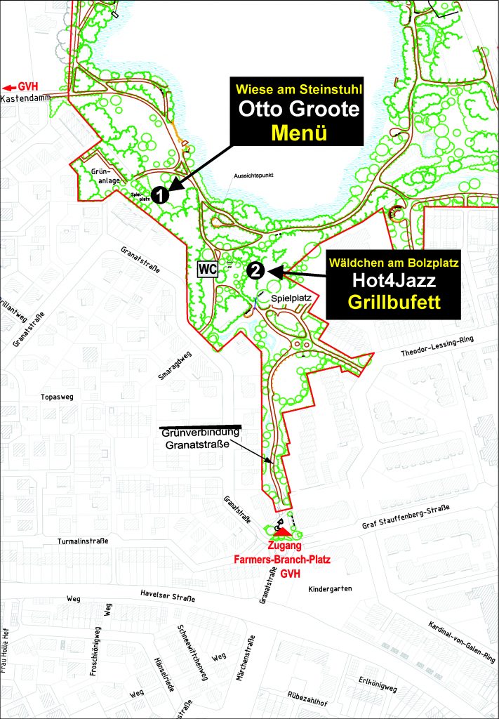 Am zweiten Standort, dem Wäldchen am Bolzplatz, serviert Familie Rahlfes ein Drei-Gänge-Menü: Nach Räucherlachstartar und Forellenmousse auf hausgemachtem Rösti mit Creme Fraiche und Salatbouquet gibt es als Hauptgang Schweinefilet im Kräuter-Schinkenmantel mit dunkler Schalottenjus, grünem Spargel und Kartoffelgratin. Zum Nachtisch wird Zitronen-Joghurt-Tiramisu mit frischen Beerenfrüchten und Espressoschaum serviert. Den musikalischen Part übernimmt die Garbsener Formation Hot4Jazz.