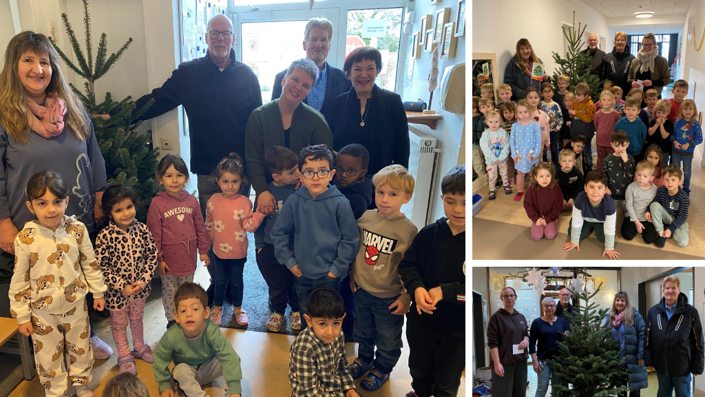Den Auftakt machte der Besuch im DRK Kindergarten Farbenfroh in Frielingen. Vorstandsmitglied Peter Baars, Stiftungsratsvorsitzender Wolfgang Galler sowie die Vorsitzende der Stiftung, Daniela Grunwald-Galler, wurden dort von der stellvertretenden Leiterin Frau Beermann begrüßt. Sie erklärte, dass das Team noch berate, wofür die Spende eingesetzt werden soll: „Vielleicht für die Gestaltung des Außengeländes oder den großen Bewegungsraum – wir schauen gemeinsam, was den größten Mehrwert hat.“ Fest stand allerdings sofort: Der Baum wird zusammen mit den Kindern geschmückt.