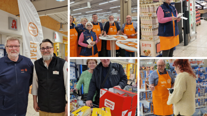 Zwischen 10 und 18 Uhr waren 25 Ehrenamtliche der Tafel in sechs Teams vor Ort. Sie informierten über die Arbeit der Tafel, beantworteten Fragen, nahmen Spenden entgegen und sorgten gleichzeitig für die Sortierung der Waren in der Ausgabestelle. Neben den gesammelten haltbaren Produkten kamen auch zahlreiche frische Lebensmittel zusammen – darunter Kartoffeln, Äpfel, Zwiebeln und sogar zwei große Eimer Apfelsinen.