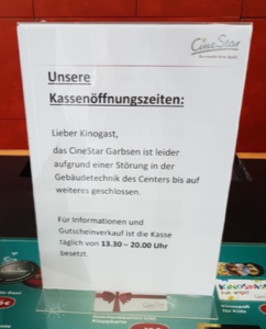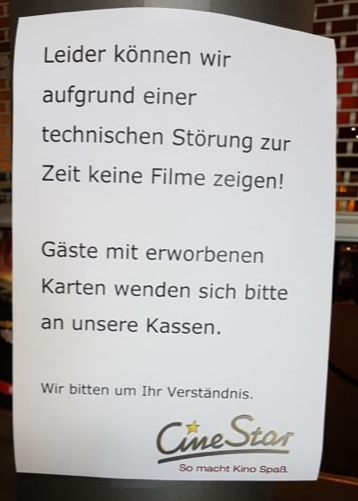 Lediglich ein Zettel an der Eingangstür weist auf einen technischen Defekt hin, der das Zeigen von Filmen zur Zeit verhindert. Kinokarten-Inhaber können sich zu speziellen Öffnungszeiten an den Kassen des Kinos informieren oder die Tickets zurückgeben.