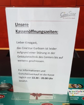 Das eher schlechte Wetter am Wochenende, gerade am Sonntag brachte viele Garbsener Bürgerinnen und Bürgern auf die Idee, sich doch mal wieder einen Film im Kino anzusehen. Doch viele unserer Leser/innen standen hier vor verschlossenen Türen.