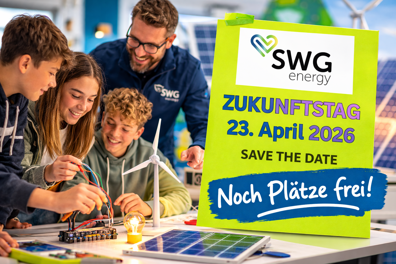 Am Donnerstag, 23. April 2026, öffnet der kommunale Energieversorger seine Türen für neugierige Jugendliche der 5. bis 10. Klassen. Die Teilnehmerinnen und Teilnehmer haben an diesem Tag die Möglichkeit, den Mitarbeitenden der Stadtwerke über die Schulter zu schauen und spannende Einblicke in die Welt der Energieversorgung zu bekommen.