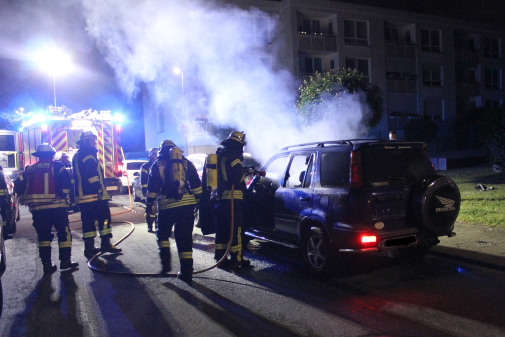 Der erste Einsatz ereignete sich gegen 2 Uhr in der Nacht im Mirahof im Stadtteil Auf der Horst. Ein dort geparkter Pkw stand beim Eintreffen der ersten Einsatzkräfte bereits in Flammen – insbesondere der Innenraum brannte lichterloh. Ein Trupp unter Atemschutz konnte den Brand mit Wasser aus einem Löschrohr eindämmen, bevor im Anschluss Brandnester mit Löschschaum abgedeckt und die Fahrzeugbatterie abgeklemmt wurden.