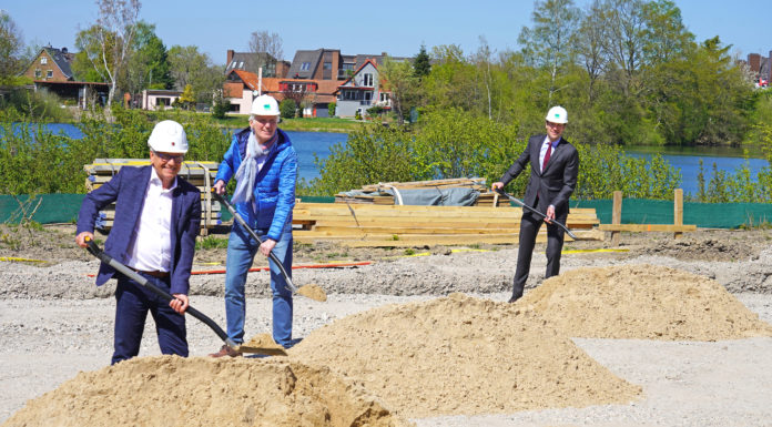 Garbsen - Das Bauprojekt „Wohnen am Bosse-See“ ist offiziell gestartet: Bürgermeister Christian Grahl, Max Bode, Vorstand der HELMA-Gruppe, und Peter Kuttner, Niederlassungsleiter der Industriebau...