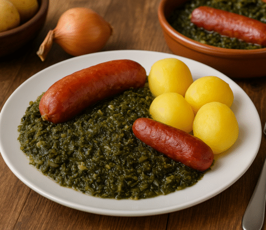 Herzhaftes Grünkohlgericht mit Bregenwurst und Salzkartoffeln – hier ein Rezept