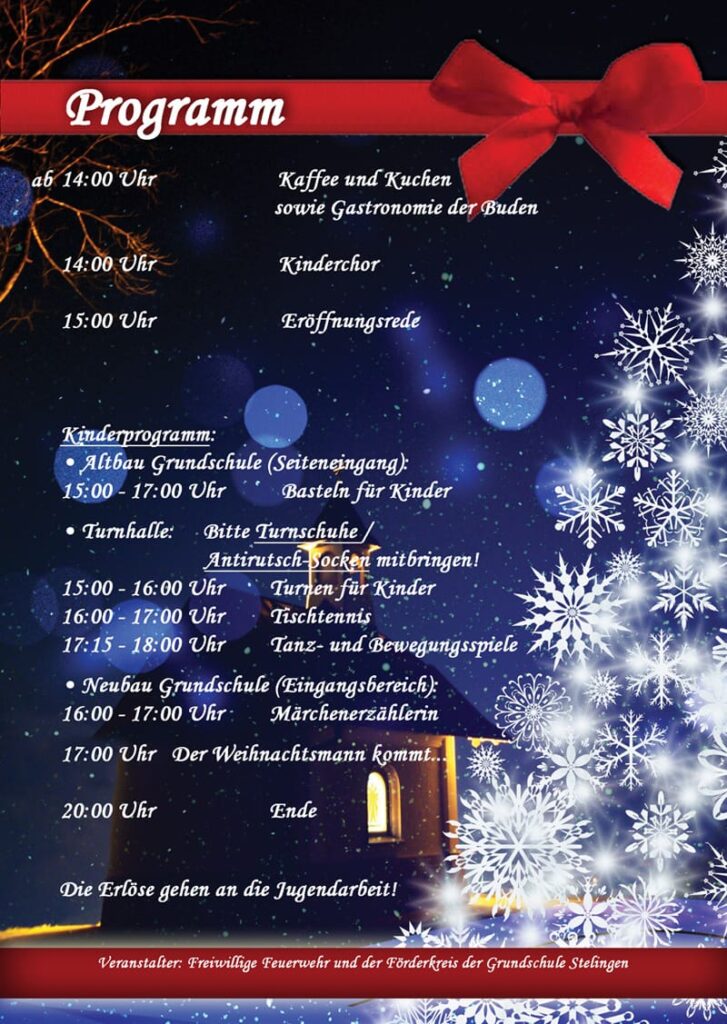 27. Stelinger Weihnachtsmarkt. Am 3. Advent, dem 15. Dezember, wird es in Garbsen-Stelingen wieder festlich! Von 14:00 bis 20:00 Uhr lädt der traditionelle Weihnachtsmarkt, mittlerweile seit 27 Jahre, alle großen und kleinen Besucher ein, die Vorweihnachtszeit in vollen Zügen zu genießen.