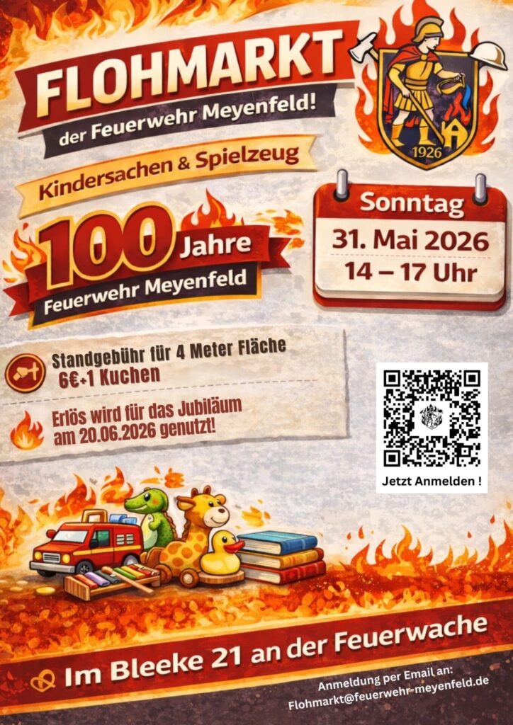 Am 31. Mai 2026 findet von 14 bis 17 Uhr ein Flohmarkt der Feuerwehr Meyenfeld statt. Angeboten werden Kindersachen und Spielsachen. . Anmeldung ab sofort möglich.