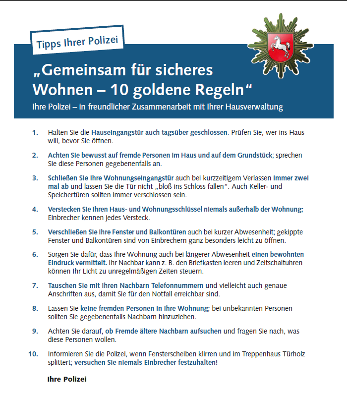 Wenn es eventuell Anzeichen für eine Abwesenheit der Anwohner gibt haben die Diebe ein leichtes Spiel. Die Polizei in Niedersachen hat in Zusammenarbeit mit Hausverwaltungen 10 goldene Regeln zusammengestellt um sich während der Ferienzeit vor Dieben zu schützen: