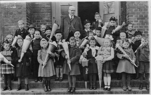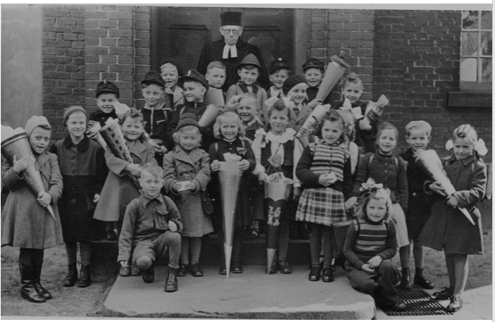 Hier sind Fotos von Erichs Einschulung 1951 in der Osterbergschule und kurz danach. Auf den Fotos zu sehen… der Klassenlehrer und ein Pfarrer. Allein die Bildbeschreibung, die Erich uns übersendet hat, regen zum Schmunzeln an, erschrecken aber gleichzeitig. Damals wurden die Schüler tatsächlich noch mit einer Ohrfeige bestraft, wenn Sie nicht gehorcht haben.