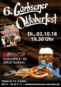 Garbsen – Am Dienstag, den 02. Oktober 2018 ab 19:30 Uhr ist es wieder soweit! Garbsen feiert bereits zum 6. Mal Oktoberfest bei Auto Schrader an der B6.