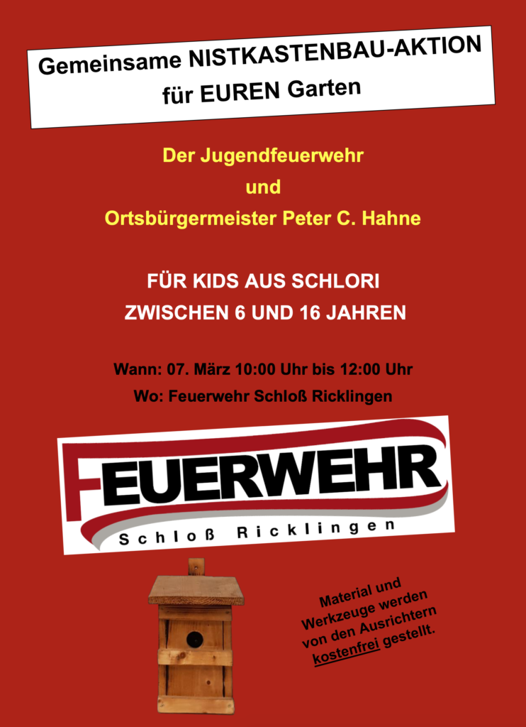 Garbsen – Die Jugendfeuerwehr aus Schloss-Ricklingen und der Ortsbürgermeister Peter C. Hahne organisieren eine Nistkastenbau-Aktion in Schloß Ricklingen.