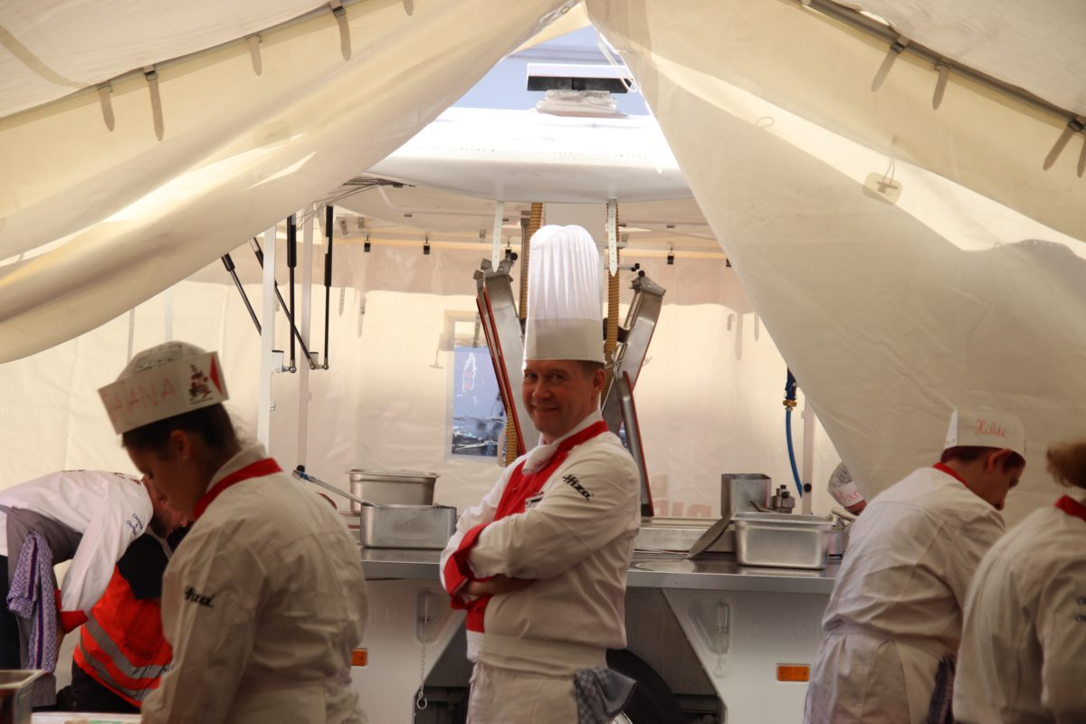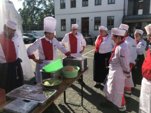 Auf das Kommando des gewählten Küchenchefs gab es dann Champignon- Rahmsuppe mit Croutons und Lauchzwiebeln als Vorspeise. Es folgten als Hauptgang gebackene Geflügelsticks in Panko paniert an Ratatouille und Kartoffel-Tomaten-Gratin. Den Abschluss bildete eine Mandel-Grießcreme an Waldbeerenfruchtsauce mit Obstsalat und dunkler Salty-Caramel-Crumble vom Bitterschokoladenkeks.