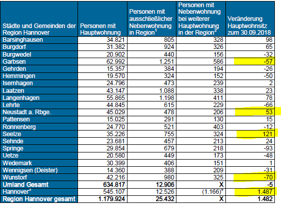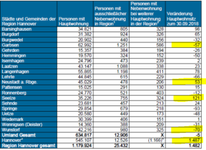 Bezogen allein auf das vierte Quartal 2018 entwickelt sich die Bevölkerungszahl in der Landeshauptstadt Hannover und im Umland dabei unterschiedlich. Während Hannover einen deutlichen Bevölkerungszuwachs verzeichnet, ist die Bevölkerungszahl im Umland insgesamt stagnierend beziehungsweise sehr leicht rückläufig: Zehn Kommunen hatten im jüngst abgelaufenen Quartal einen Bevölkerungszuwachs und zehn Kommunen einen Bevölkerungsrückgang.